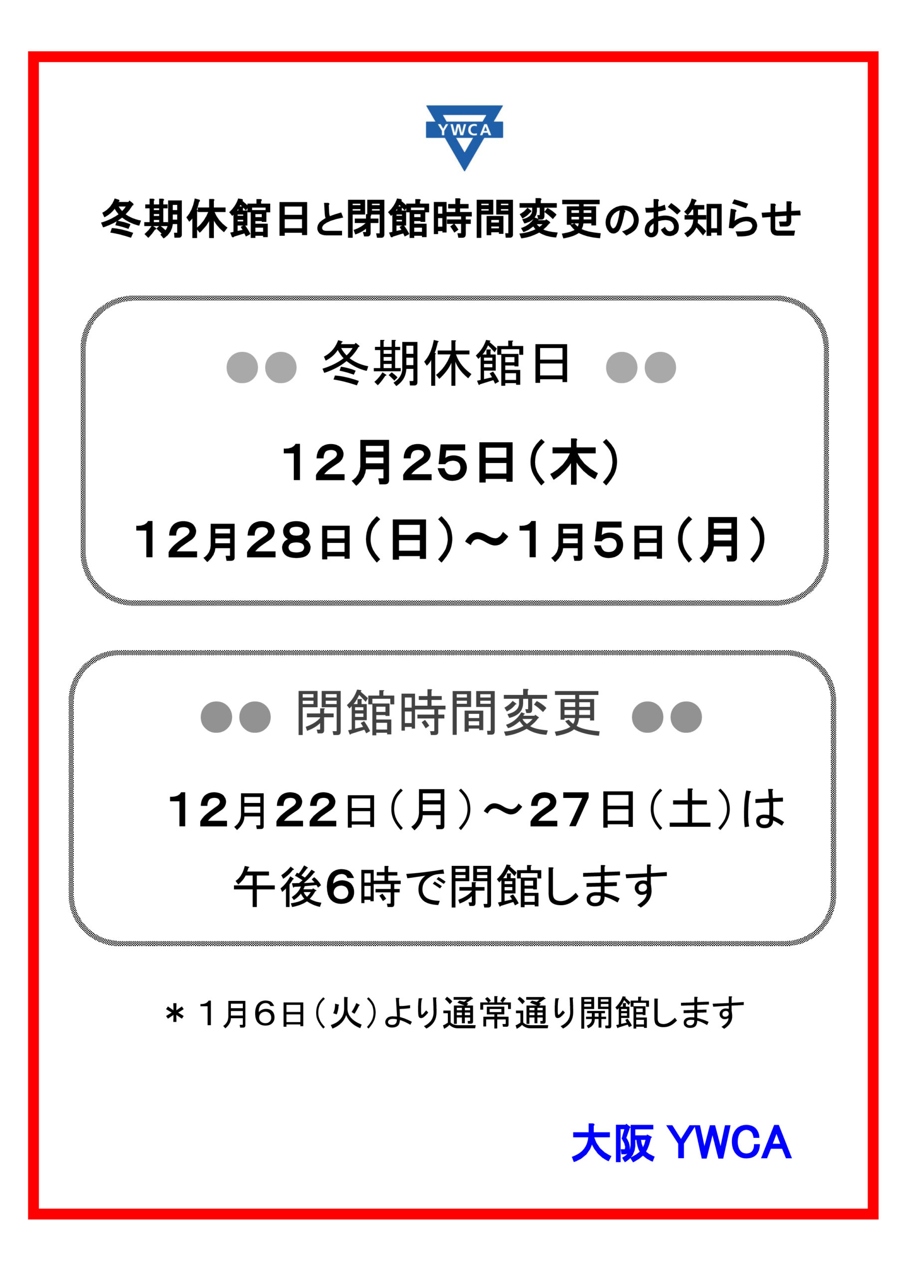 大阪YWCA専門学校では12月25日(木)と12月28日(日)~1月5日(月)まで冬期休館となります。
